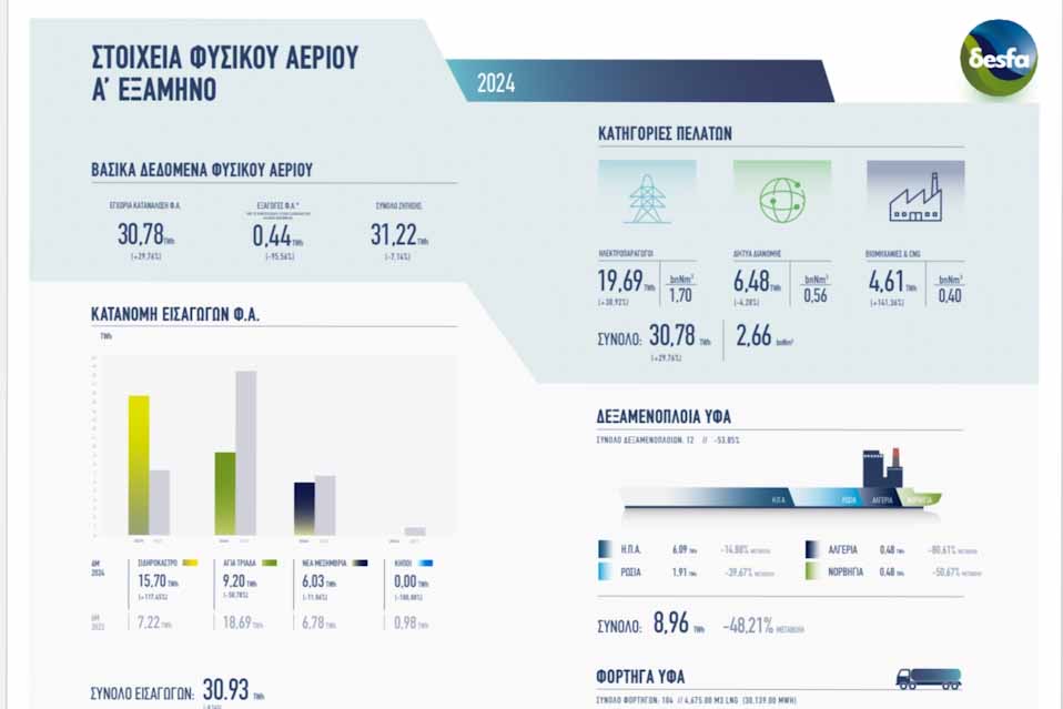 Στοιχεία ΔΕΣΦΑ για την κατανάλωση φυσικού αερίου το α’ εξάμηνο του 2024:
