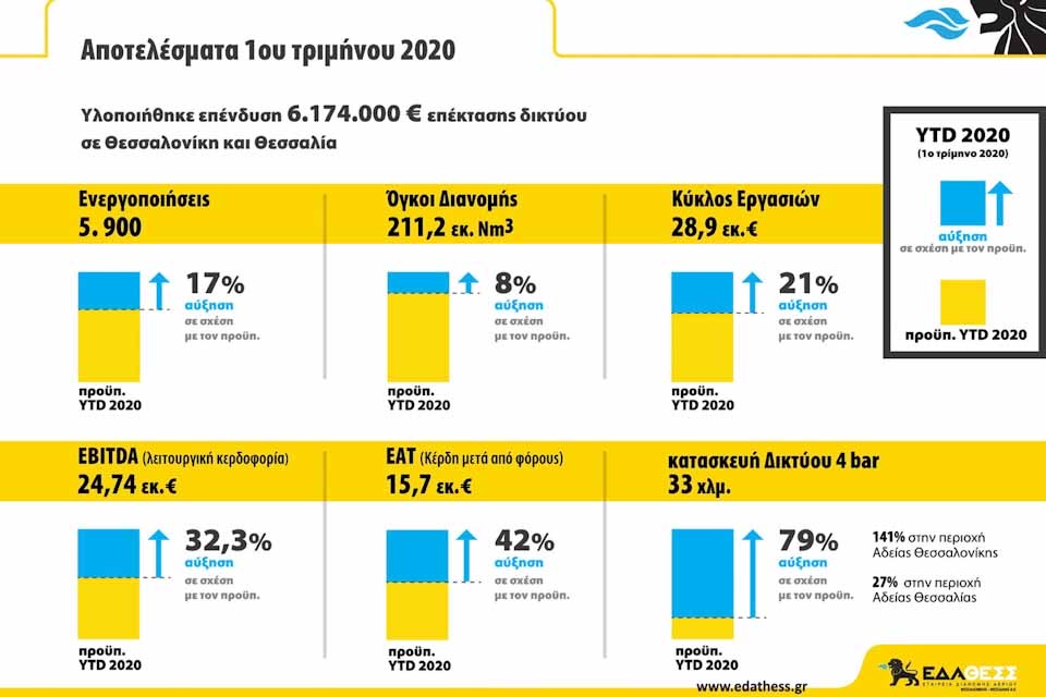 Συγκεκριμένα, η ΕΔΑ ΘΕΣΣ έκλεισε το πρώτο τρίμηνο του 2020 προσθέτοντας στην περιουσιακή της βάση 5.900 ενεργοποιήσεις νέων σημείων παράδοσης-(καταναλωτών φυσικού αερίου), αυξημένες μάλιστα, κατά 17%, σε σχέση με τον προϋπολογισμό της εταιρείας. Επιπλέον, η ΕΔΑ ΘΕΣΣ συνεχίζοντας την επέκταση του δικτύου, κατασκεύασε περισσότερα από 33 χλμ. νέου δικτύου σε Θεσσαλονίκη και Θεσσαλία. Συνολικά, οι επενδύσεις της εταιρείας για την επέκταση του δικτύου σε αυτό το διάστημα ανέρχονται σε 6,17 εκ ευρώ.
