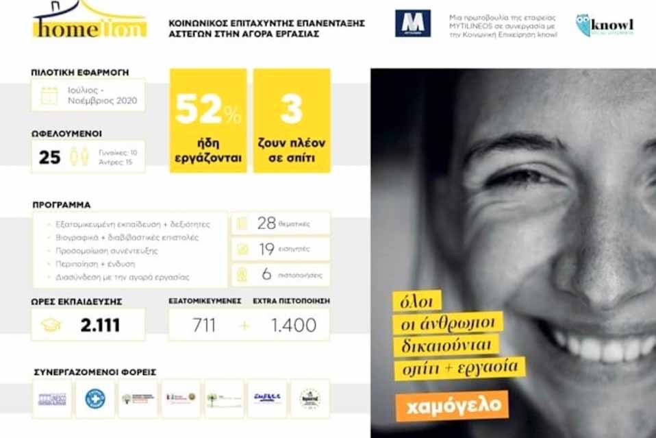 Μέσω του προγράμματος του Κοινωνικού Επιταχυντή Ένταξης Αστέγων στην αγορά εργασίας, με την ονομασία HoMellon, το οποίο εκπονήθηκε σε συνεργασία με την Κοινωνική Επιχείρηση KNOWL για την εκπαίδευση και δια βίου μάθηση, 52% των ωφελούμενων πλέον εργάζεται, 6 εκπαιδεύτηκαν και πιστοποιήθηκαν σε επαγγελματικές δεξιότητες που ανταποκρίνονται σε συγκεκριμένες θέσεις στην αγορά εργασίας, και 3 άνθρωποι που ζούσαν στο δρόμο ή δομές αστέγων, επέστρεψαν και διαμένουν πλέον σε σπίτια[1].