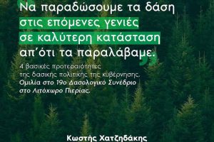 Η ολοκλήρωση του μεγάλου έργου των Δασικών Χαρτών, ο αντιπυρικός σχεδιασμός, με έμφαση στην πρόληψη των δασικών πυρκαγιών και στην αποκατάσταση των καμένων εκτάσεων, η άμεση υλοποίηση όλων των απαιτούμενων διαδικασιών για τα δασικά μέτρα της προγραμματικής περιόδου 2014 – 2020 του Προγράμματος Αγροτικής Ανάπτυξης και δασικής διοίκησης ήταν η τέσσερις άξονες στους οποίους εστίασε ο υπουργός Περιβάλλοντος και Ενέργειας Κωστής Χατζηδάκης κατά την ομιλία του στην έναρξη του 19ου Πανελλήνιου Δασολογικού Συνεδρίου που διεξάγεται στο Λιτόχωρο Πιερίας.